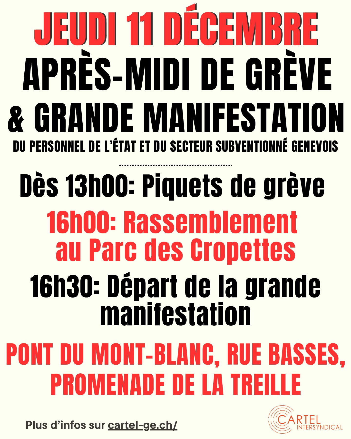 16h30 – Départ de la manifestation: Pont du Mont-Blanc, Rues Basses, Promenade de la Treille